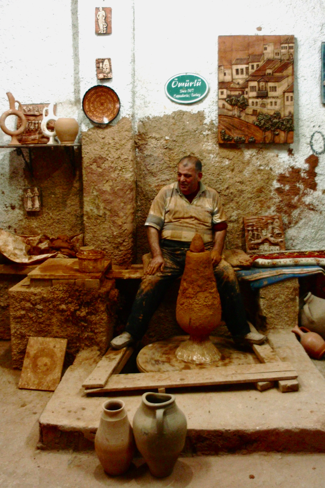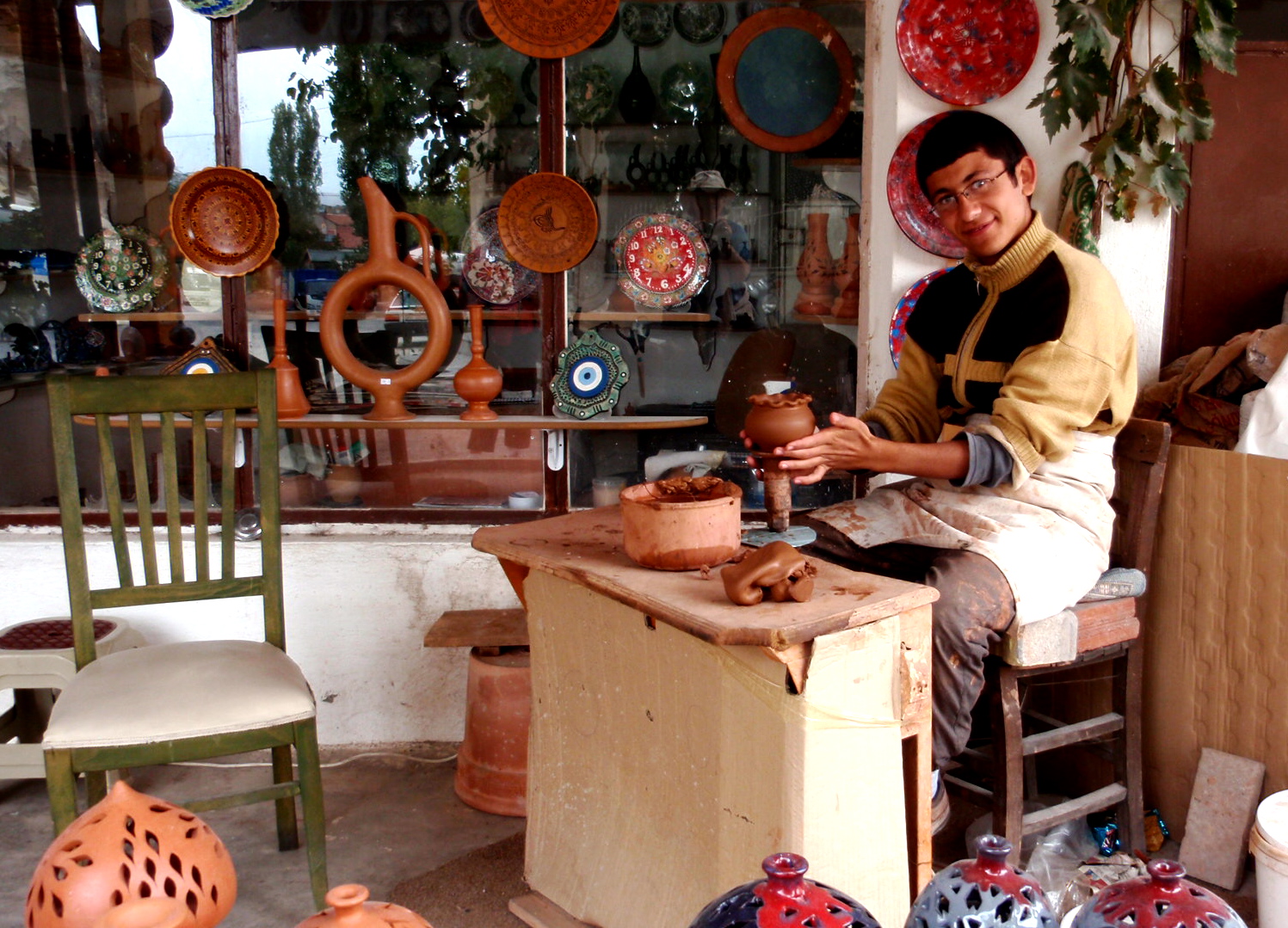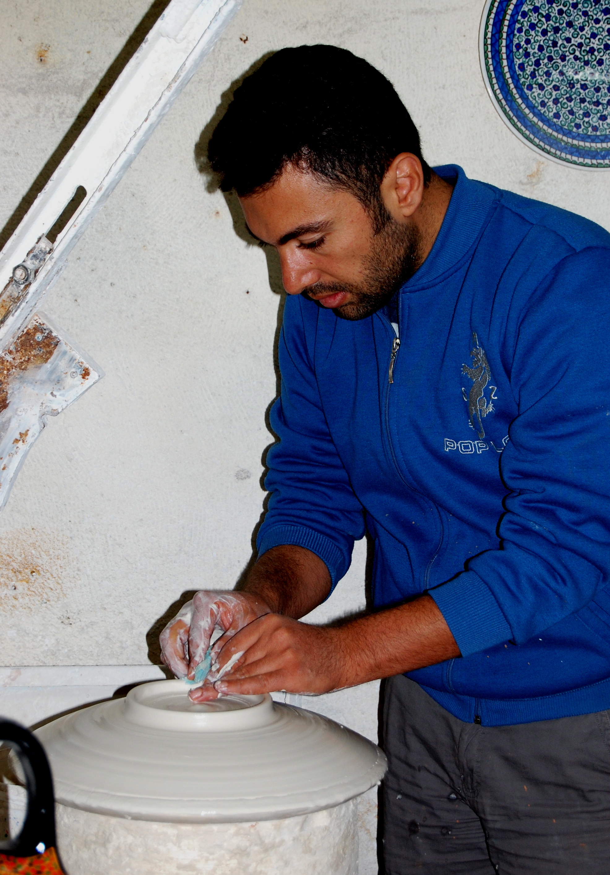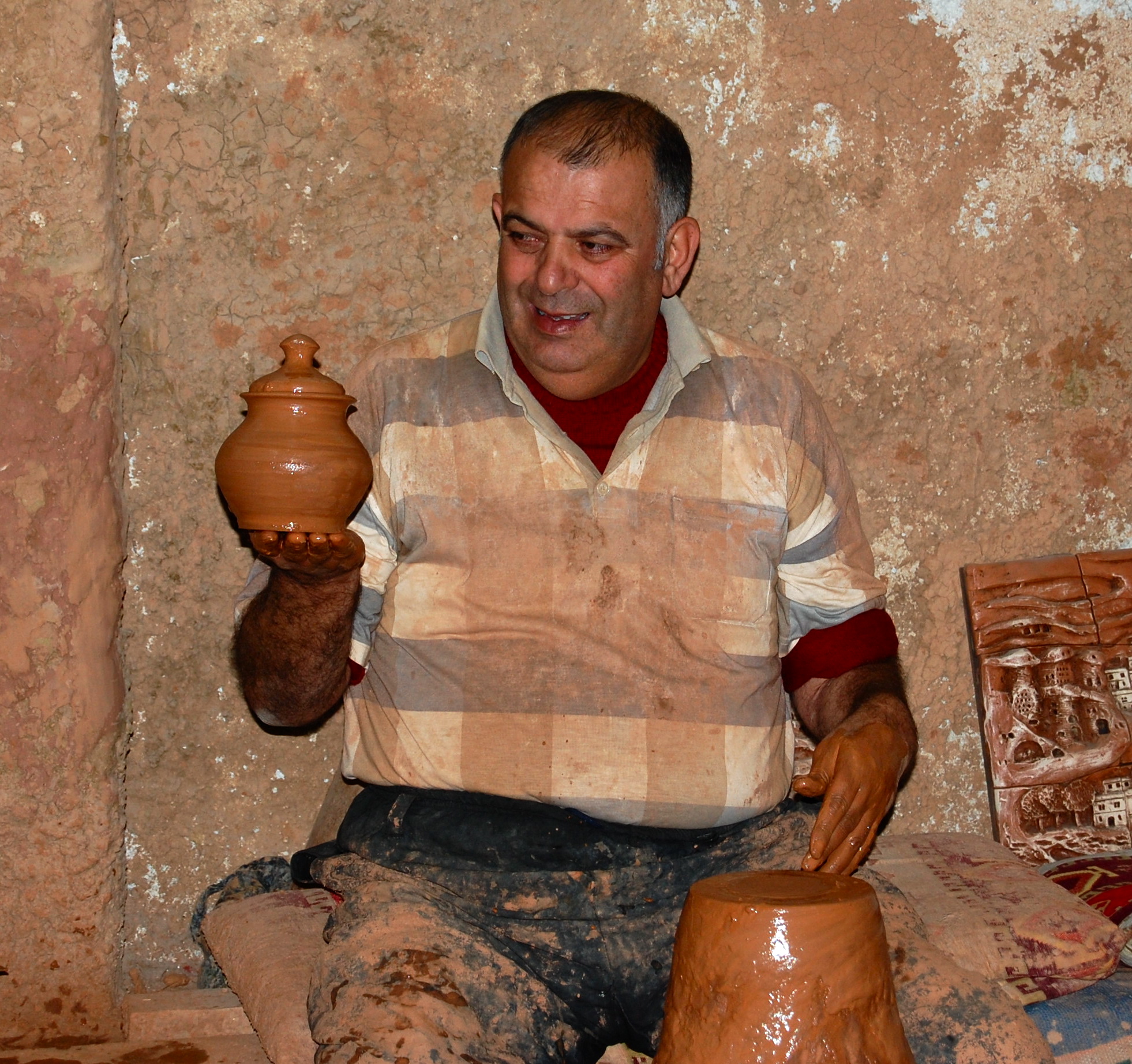 I happened on the first pottery, chez Mumtaz, after we’d been walking around some carved-in-the-cliff houses. The young guy posed nicely for me with a pot he’d just made.