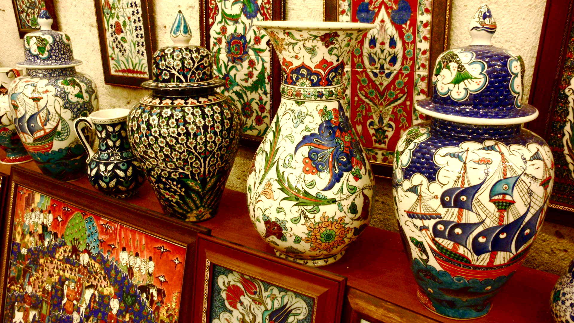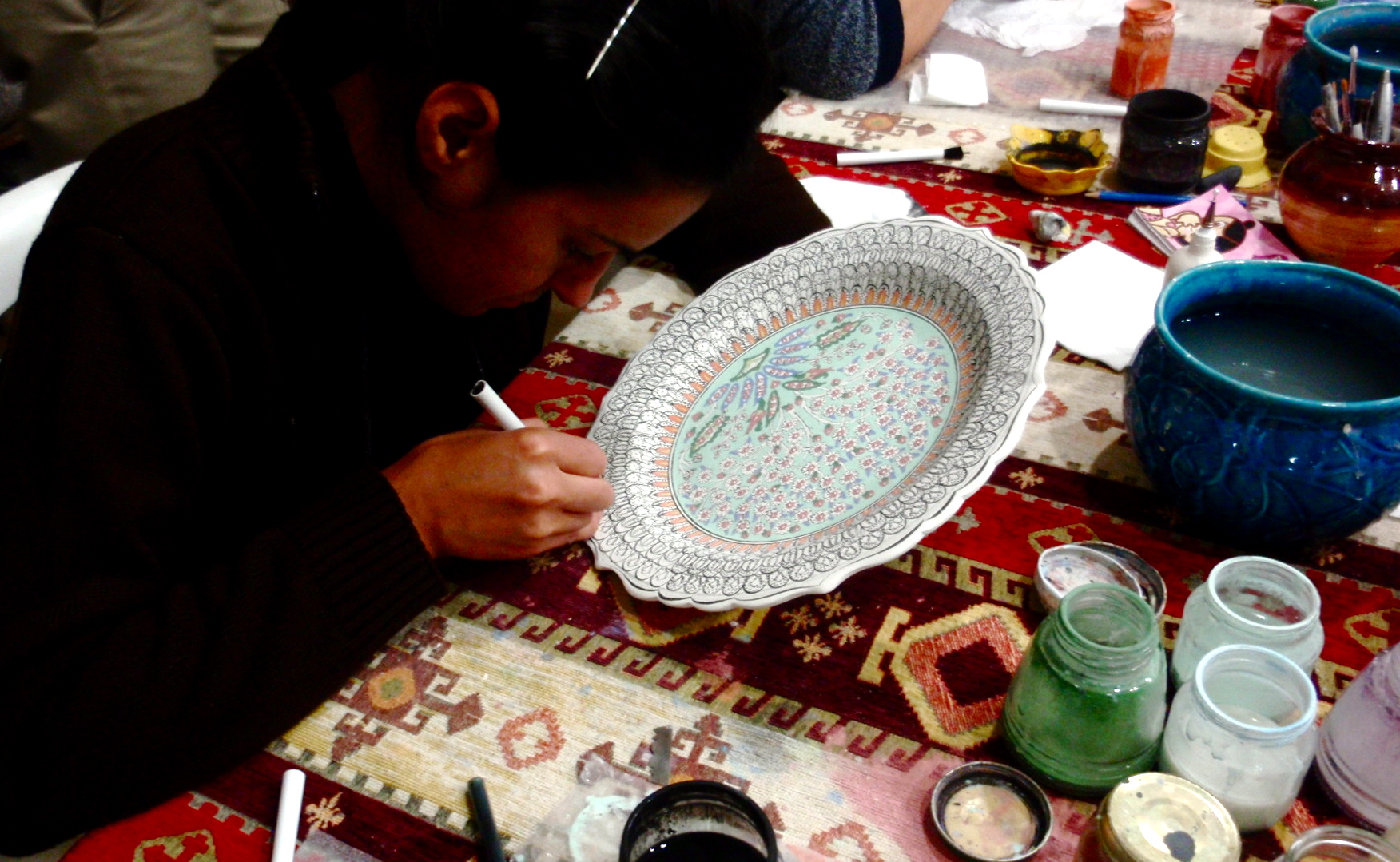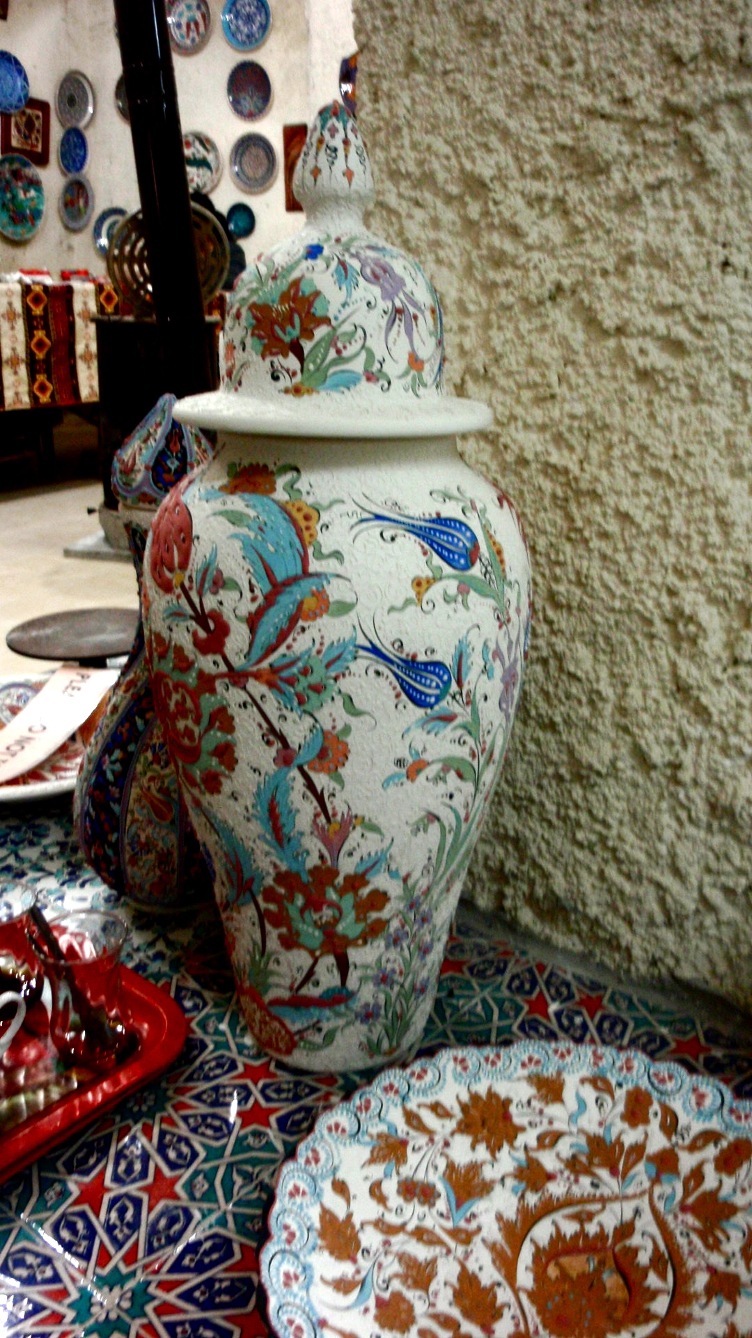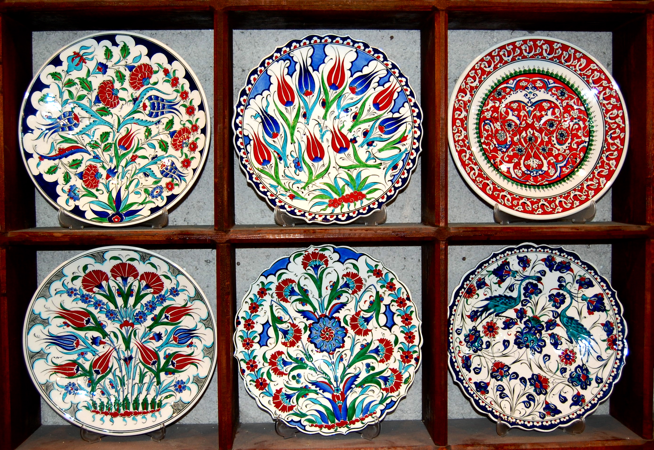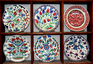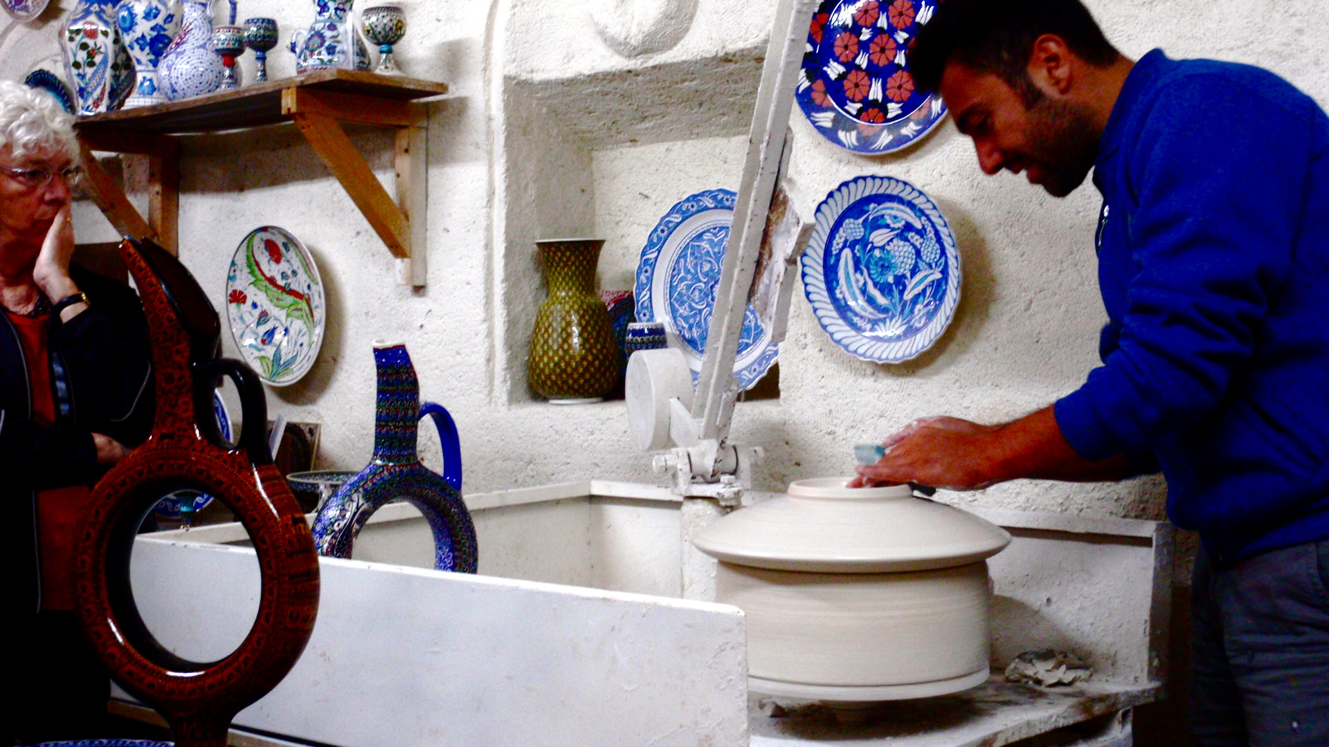 Next day we were entertained at the Omurlu Ceramic workshop. A potter demonstrated throwing Cappadocia red clay on a kick wheel. Everything else featured a white clay, probably from Iznik. We saw a bowl/platter being made over a plaster mould, an array of slip-poured forms and women painstakingly painting plates. The over-the-top overglaze colour designs are the distinctive design for this workshop. In the showrooms there are expensive, probably high-fire pieces in more traditional Iznik designs and then there are hundreds of more affordable white earthenware pieces – vases, bowls, plates, jars. We chose one plate to bring home like the ones in the last photo.