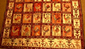 The bottles in the next photo are old ones in an antique shop – certainly Cappadocia clay. We were taken to a carpet shop of course and I fell in love with this silk one – quite priceless so a photo is enough!