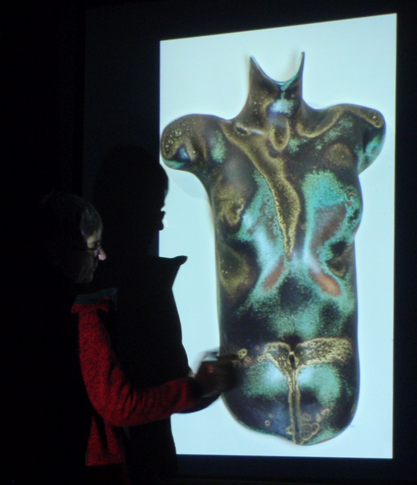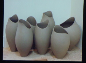 After grabbing coffee we were treated to a Power Point Presentation of images covering Mary’s career in clay since the seventies. Her distinctive forms with their layered, crawled surfaces are well-known but she explained that she enjoys equally the relaxation of throwing her line of functional ware.