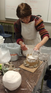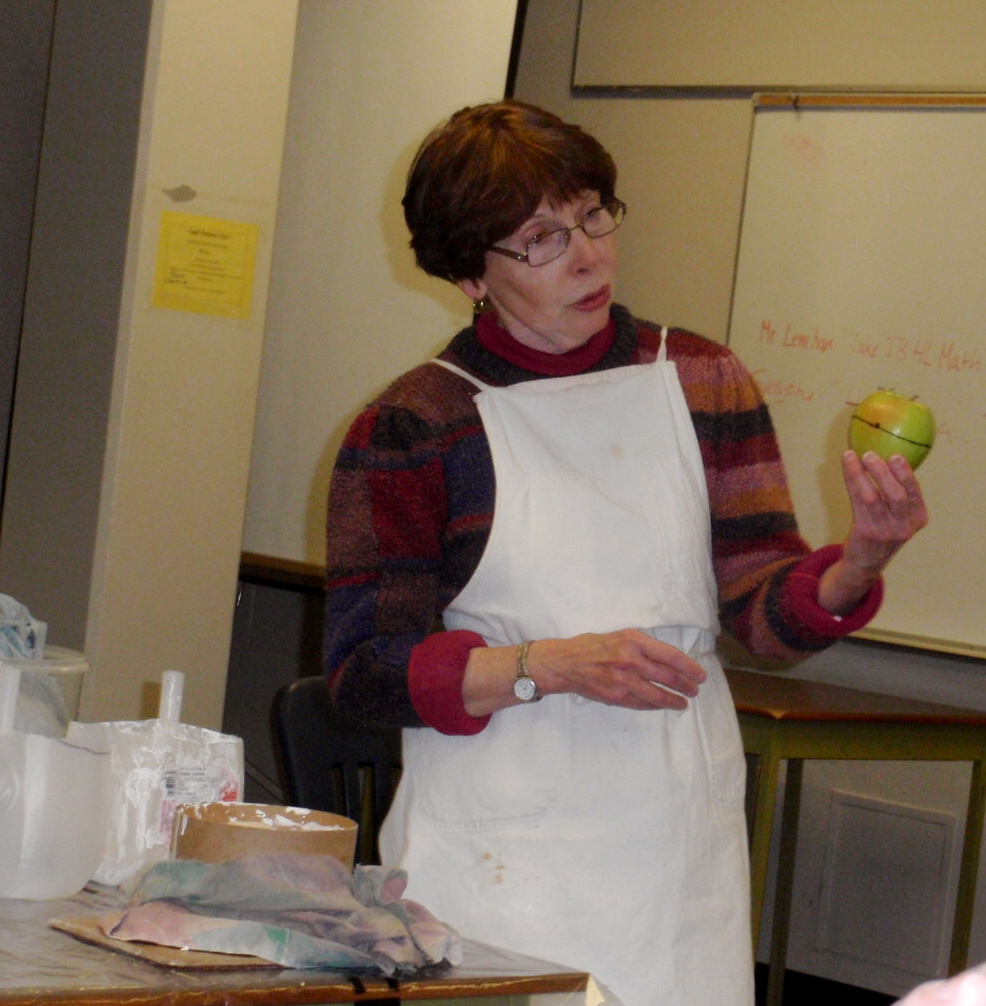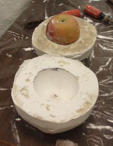 Kay started right at 7pm by explaining the process, showed samples of one and many-piece moulds and a completed apple mould to be opened later. A pear had one half already in a plaster mould and she coated the other side with a resistant oil (tell me its name, Kay!), surrounded it with a cardboard wall, mixed the plaster and applied it to the pear.