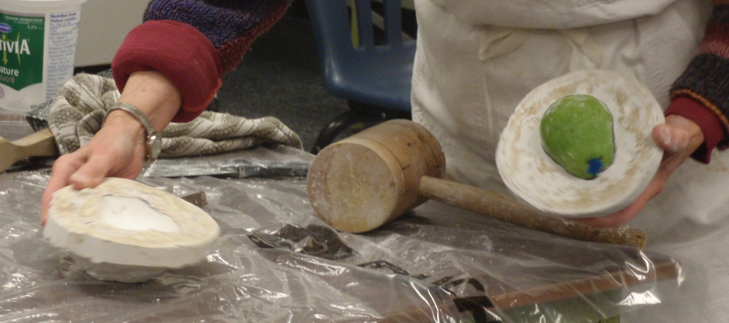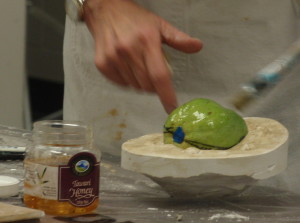 With the leftover plaster she showed that you can add more to add to an already finished mould if it is soaked in water for 30 minutes. While the plaster set up we had our usual announcements, coffee and chat. To finish the evening Kay separated both the apple and pear moulds to excited applause from us!