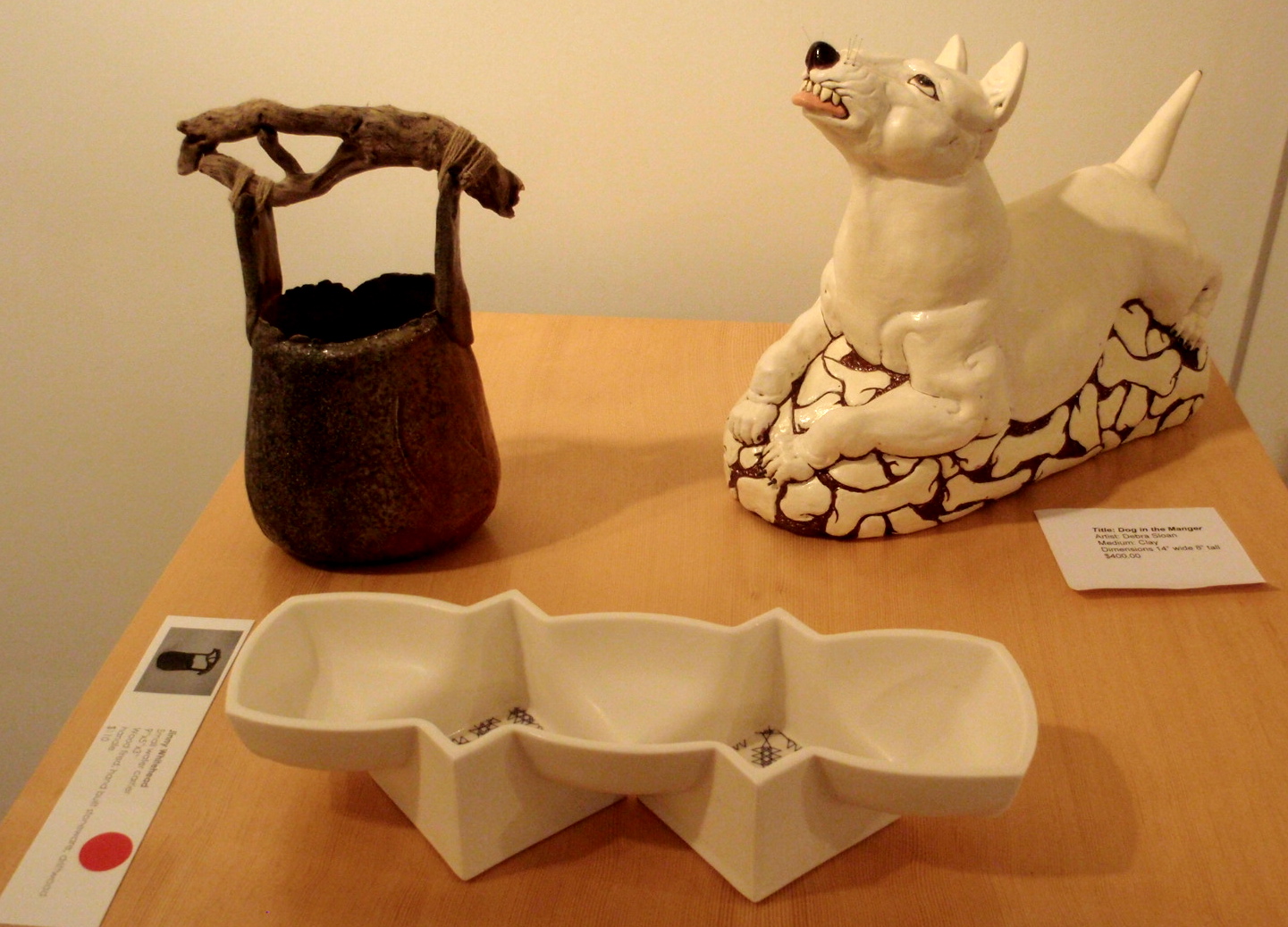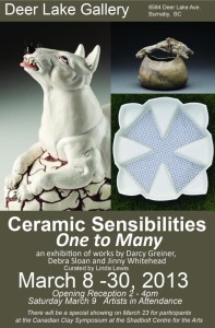 BC Potters Guild webmaster and Burnaby Arts Council board member Linda Lewis has curated a show, ‘Ceramic Sensibilities: One to Many’. The opening was on Saturday, so knowing that I would be unable to attend I stopped in at the Deer Lake Art Gallery on my way to Granville Island on Thursday afternoon, just after the show was set up.