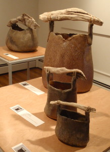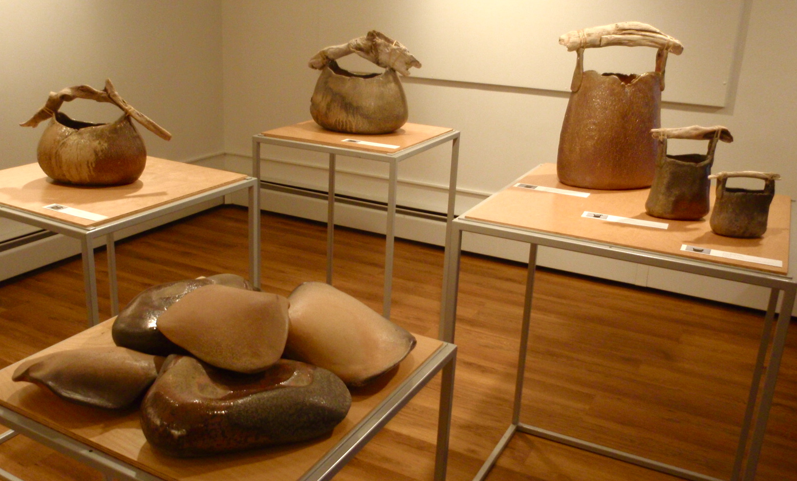 Past-president of BC Potters Guild, Jinny Whitehead’s work is wood-fired and one would expect a variety of forms. But she obviously enjoys the idea of baskets and for this show we see a selection of warm-coloured, textured vessels, each with a hand-made drift-wood handle. Although they vary in size the familiar shape is repeated.