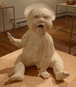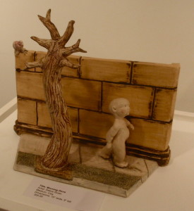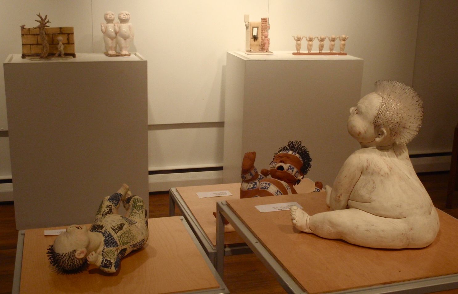 Clay sculptor Debra Sloan, already en route to another two-month ceramic residency in Hungary, has been focussing on making small babies from a mould. These have been installed in little stage settings. Alongside them are some much bigger, sometimes patterned, in one case alarming babies! She also loves dogs but the ‘many’ for her in this show are the babies.
