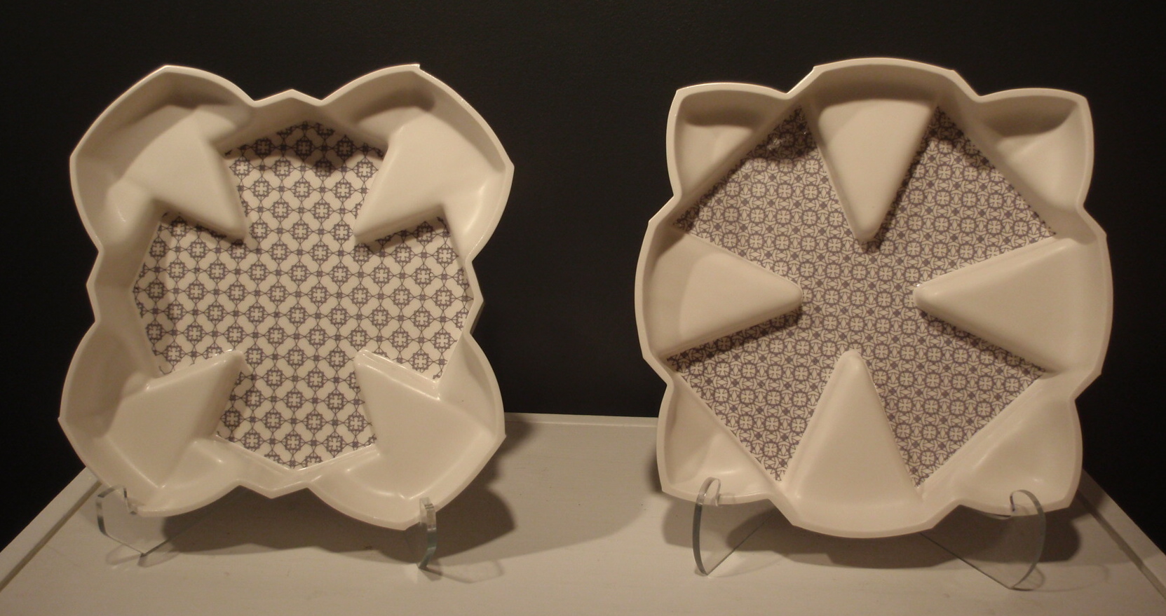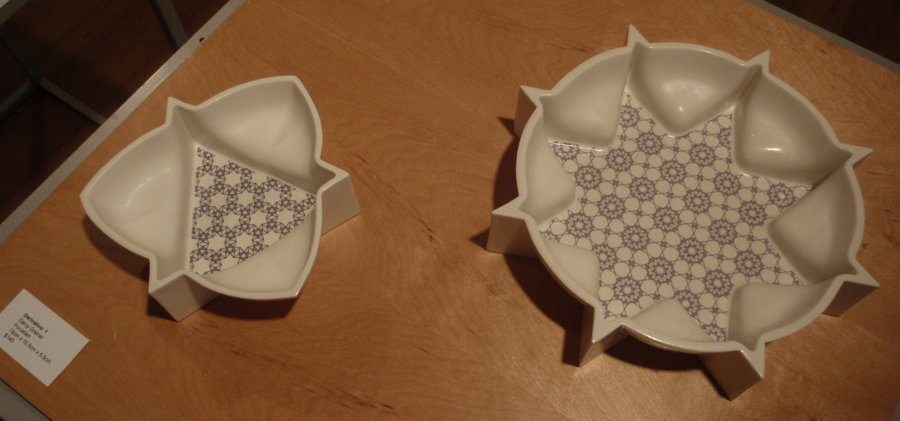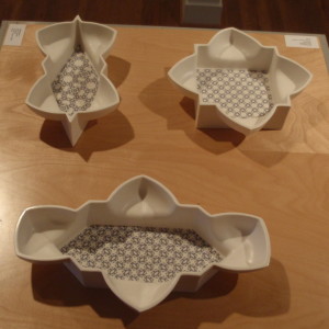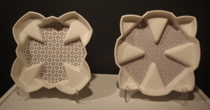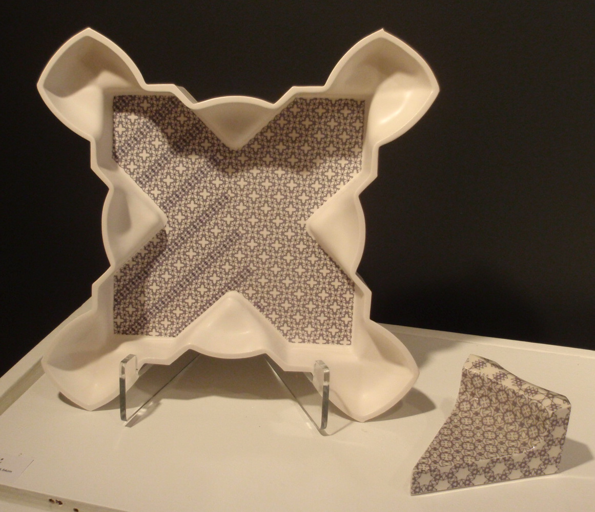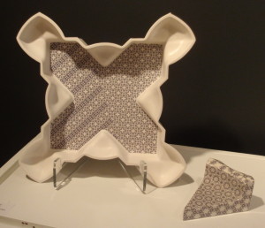 Darcy Greiner, who was one of 6 artists featured in the Gallery of BC Ceramics’ recent show ‘Evocativa Curiosa’, works very carefully and mathematically with moulded pieces. Displayed is a decorated pie form and Linda showed me how Darcy has used this to produce all the other forms in the show. Even the transfer pattern on and in them is a version of the design formed by repeating the original shape.