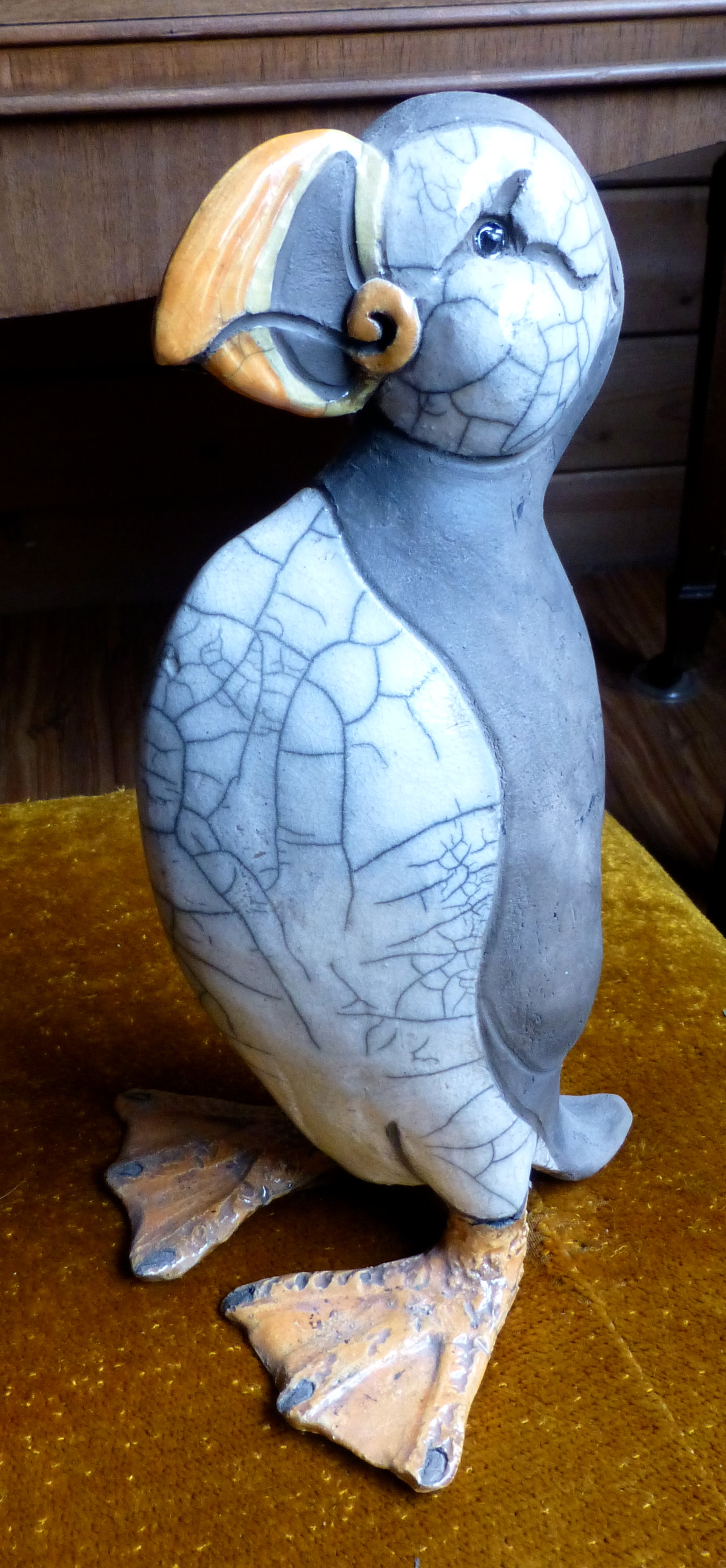 The Beck’s daughter Sarah is also a potter and is a fiddle-player. Where better to live than on the other side of the country in Cape Breton, Nova Scotia? There she and her musician husband have a house and separate studio right on the Cabot Trail. The day after I left Williams Lake Joan and Reg left to drive to Calgary to see their other daughter Karen. Joan planned to fly on to Nova Scotia after that and spend some time with Sarah in her pottery studio. Sarah also comes back for a Winter time sale with her mom. How come neither of my sons took up pottery? I admired this raku puffin at Joan’s and am told it’s one of Sarah’s, a popular item for Maritime sales.