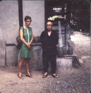 During conversations with Joan and Reg Beck I asked about their careers and travels. It turns out that long before they became teachers in Williams Lake they had taken a long journey around much of the world. At one point Joan (who had already taken some pottery classes with Vancouver’s Ross Huyghe, no less) and a friend found themselves in Mashiko, Japan and asked where Shoji Hamada lived. Hamada of course is the famous Japanese potter who became a close friend of Bernard Leach. Joan and her friend were warmly welcomed, and were even invited to stay the night. What a magical thing to happen to a potter just at the beginning of her career! Reg gave me this photo of Joan with Shoji Hamada in 1970.
