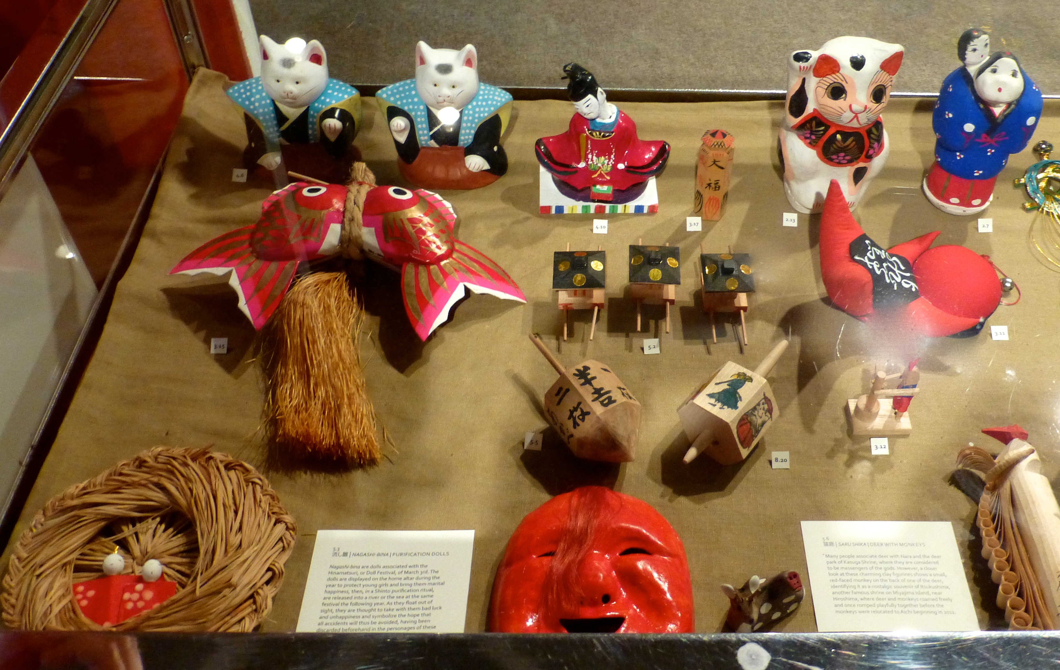 After the brief talk we were invited to enjoy the historic collection. I was surprised not to see any fellow potters in the audience, but was also disappointed not to find many Mingei pots in the show. I took quite a few photos of the items in the display cases and enjoyed the variety and humour of these toys and decorations. It was interesting to note that the Nikkei Cultural Centre’s gift shop offers a similar selection of gifts, but contemporary. P1060208