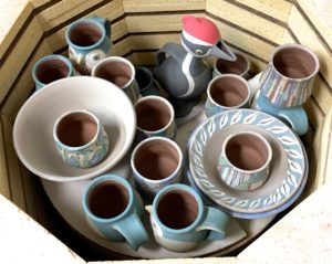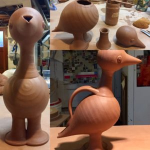 Since then I have concentrated on making sure I had at least one special jugbird for our show, have painted a large platter with a fish hatchery theme, have thrown and decorated some bowls and finished painting some yunomis and bird mugs.