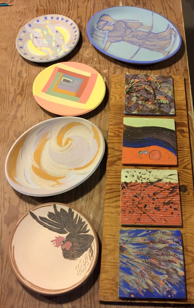 Gay, who is actually best known as a painter and instructor too, spends an awful lot of her time taking classes and attending drop-in times in the clay department of Port Moody Arts Centre. She had painted some tiles for her recent show at Gallery Bistro and asked me to make some more, in red clay, for her painting day. She also painted a large oval platter.