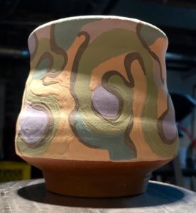 I knew it wouldn’t be long before local, i.e. not Vancouver-based, artists would wonder if they could also have a go at painting on a non-canvas or paper surface, and join me to paint with underglazes on a Gill-made plate. Port Moody artist and instructor Judith Atkinson wondered, so I invited some of the TriCity potters who I know particularly like painting on a surface as well as making pots. On a Monday a couple of weeks ago Maria Palotas, Ysabella Choung and Gay Mitchell joined Judith here. Not to confuse local artists with my Vancouver Raiders I’ve dubbed them Port Painters.