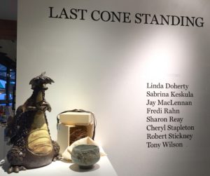 The opening of ‘Last Cone Standing’ was last Thursday when TriCity Potters’ Celebration in Clay and fire/water at Amelia Douglas had their show openings too. I attended the Port Moody event and then managed to get to Douglas College on Saturday. I’ll show photos of those two shows in my next blogs.