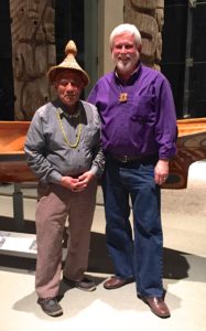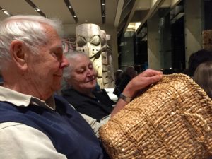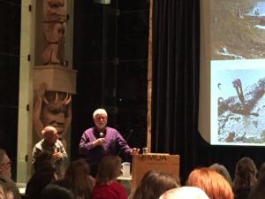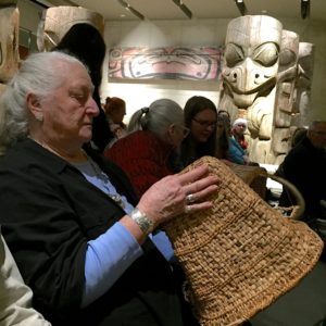 Last week the two of them were in Vancouver to promote the book they have produced together, “Re-Awakening Ancient Salish Sea Basketry”. They gave a talk in the Great Hall at UBC’s Museum of Anthropology. They explained how their paths had converged and showed us the beautifully woven pieces Ed has made. The baskets were passed around amongst the audience. Ed says that, like pottery and all hand-made crafts, the work should be handled. Dale can make these baskets too, of course, but I’m just delighted that, as a retired Anthropology professor, he is now spending much of his time accompanying Ed on travels and recording the ancient techniques.