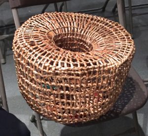 The upshot is that Ed has made a second career of studying the old basket fragments, understanding the different weaving techniques and materials which had been used for clam baskets, fish-nets and ropes, cedar clothing and traps, and now demonstrating his skills to his people. His goal is to revive the tradition and make sure that what he has learned from ancient samples will be preserved for the future. Dale has arranged for Ed to appear at Archaeology, Weaving and Wet Site conferences and together they have travelled to Japan, New Zealand, England and Belgium and around much of North America.