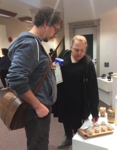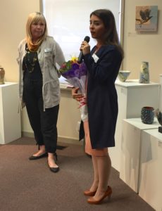 Port Moody Arts Centre’s gallery manager, Janice Cotter, welcomed artists and visitors, expressed thanks for funding and volunteers and introduced the artists showing in the three galleries. The two artists featured in the two smaller galleries were last year’s recipients of the Kwi Am Choi Awards. These are intended to provide emerging artists with funds and an exhibition opportunity in the following year.
