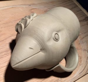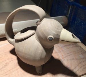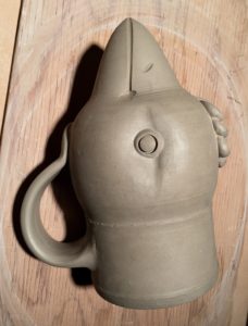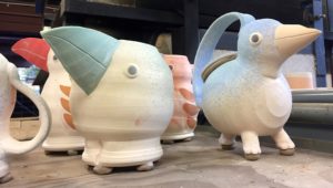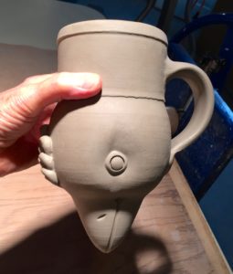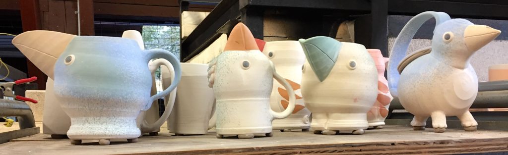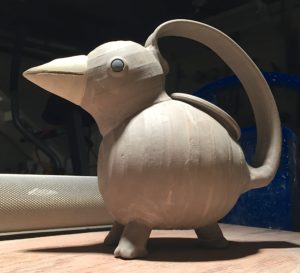 Today I drove over to Burnaby with my three boxes of bisque-fired stoneware pieces, roughly two cubic feet worth. I’ve made some more jugbirds, similar to the one that now lives on Salt Spring, invented an Odd Bird Teapot and experimented with the idea of a Greek Rhyton. Other pieces are functional mugs and yunomis, a vase and some possible gifties. I’ve made a note of which flashing slips and liner glazes I’ve applied to each piece so that I can learn some more about colour possibilities in soda.