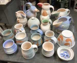 It’ll be hard to wait to see how my spraying, painting and glazing have worked but I have lots to do in the meantime. Raiders are coming out next Tuesday and I need to make a few more white earthenware plates and platters for them. The plates will help to fill the kiln and will be fired along with a few more red earthenware jugbirds that are sitting around here waiting to be painted. If there’s time I shall go ahead and do a glaze firing as well because the tiles Semiahmoo Potters painted with me are waiting for that. There’ll be lots of photos coming up!