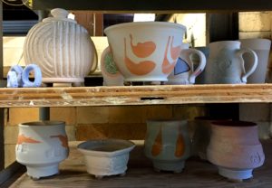 In the kiln shed the other workshop participants were busily spraying flashing slips (I’d sprayed mine at home prior to the bisque firing to ease transportation and glazing) and applying glazes. I have mainly chosen to use my own Shino glaze for lining as, when applied thinly, it produces a fine orange. But I was keen to use samples of Shadbolt ‘Teesha’ and ‘Robin’s Clear’ on just a few so did that first. Jay MacLennan was giving advice to the group, some of whom haven’t done a soda firing before, on slips, glazes and wadding.