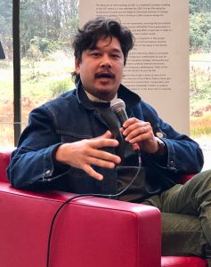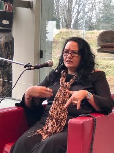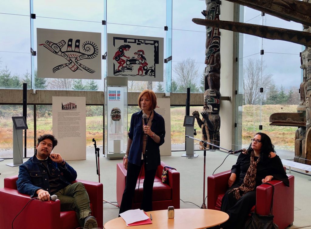 On Saturday Linda Lebrun joined me for the drive out to UBC. We arrived at the Museum of Anthropology in time to find seats in the Great Hall for ‘Catching Fire: Artists in Conversation’ at 11am. We were invited to listen to a thought-provoking afternoon of conversation with eight artists whose work is in ‘Playing with Fire’, as they discuss the pressing issues of our time. Carol, the show’s curator, started the day by asking questions of Brendan Tang and Judy Chartrand.