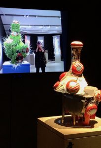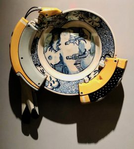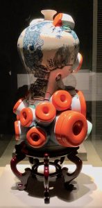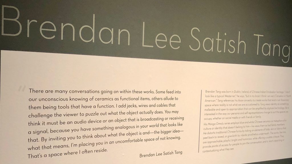 Brendan talked of the interminable question he gets.. ‘where are you from?’.. Nanaimo is his first answer, but his work is a mish-mash of cultures. His Manga-Ormolu pieces combine Japanese Manga forms with bending earthenware shapes eerily reminiscant of Oriental vases embellished in the European Ormolu fashion. He is interested in extending the seven seconds viewers normally spend looking at an art piece by having them wonder how it was made, or why, or by giving it an intriguing title.