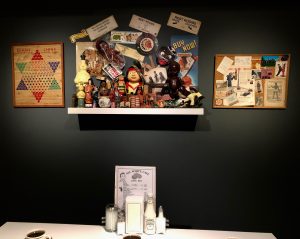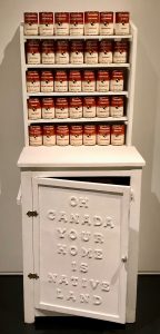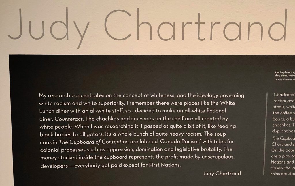 Multi-racial Brendan Lee Satish Tang and indigenous Judy Chartrand were give RACISM as a starting point. Judy, a Manitoba Cree, very definitely addresses racism in all her work. We have seen and understood the jolly cockroaches inhabiting her signature bowls as a reminder of poverty in the SROs of Vancouver’s Downtown Eastside. Being included in a large gallery exhibition has given us a chance to see her other installations which deal with White Racism. She wants white people to be pissed off.