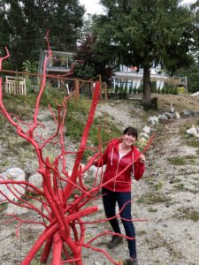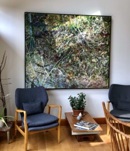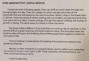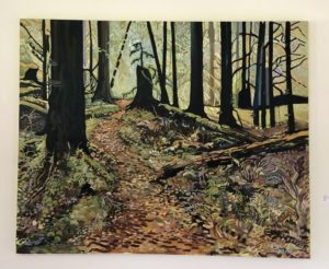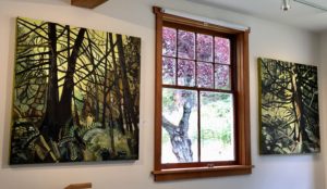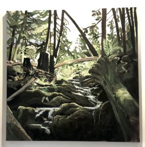 ‘Finding a Place’, the show of work by the previous two artists-in-residence was up. Annie Robinson’s work involves natural dyeing, and we saw her materials and many pieces on the walls. My apologies for not having taken some photos of them. Joshua de Groot’s paintings grabbed us. I think I’ve developed an even greater appreciation for the quiet, cool forests that surround us here in the temperate rainforest, than before the pandemic hit us. Joshua has captured the bold contrasts of colour and shapes of fallen trees, ferns, rushing water and dark tree trunks. Take a look.