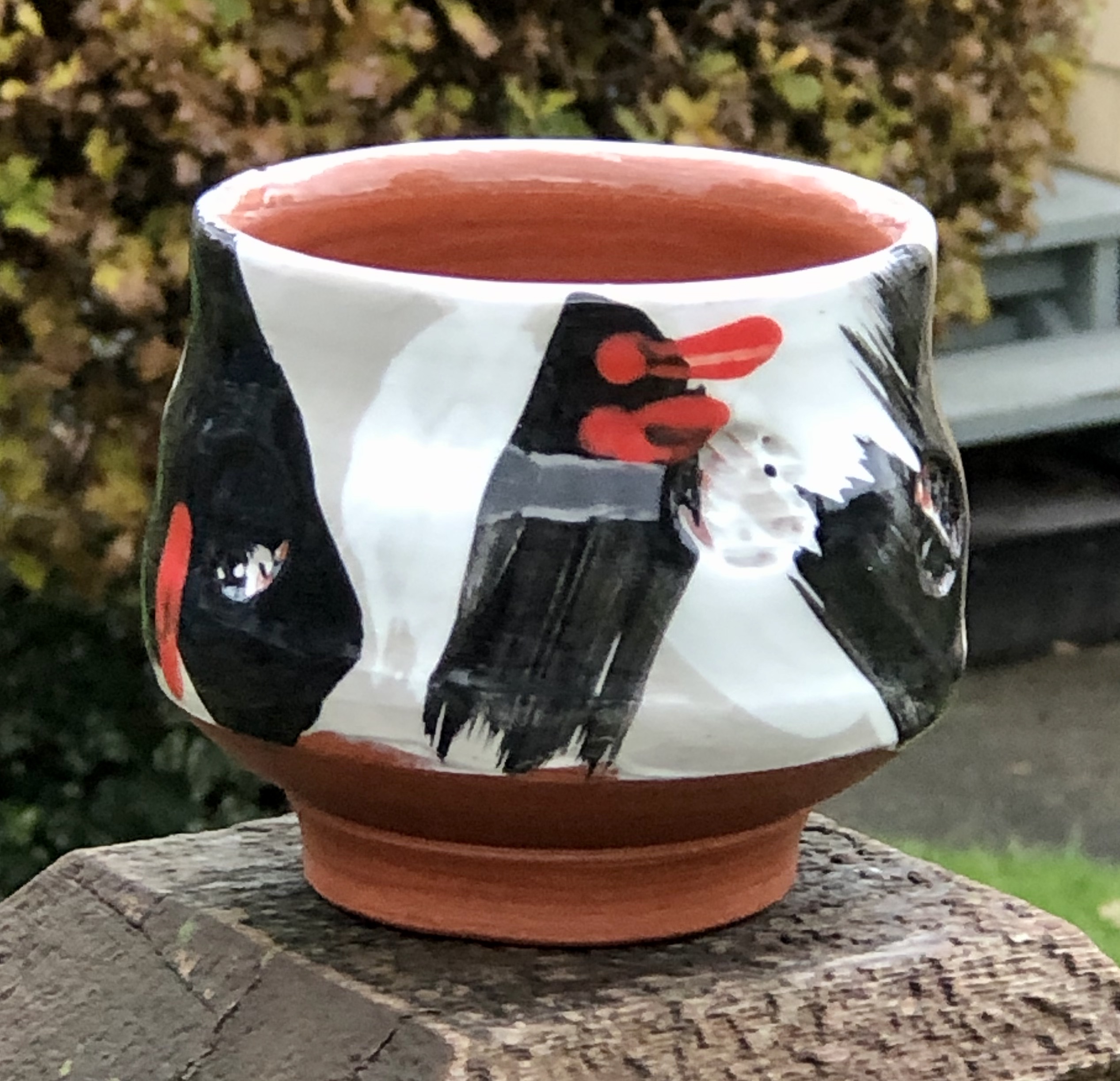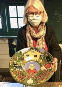 BUT, what a super surprise! long-time friend and long-ago editor of BC Potters Guild newsletter, Jan Kidnie and her husband Jim Jorgensen had an errand all the way out in Port Coquitlam yesterday morning. She asked if we could have a ‘garden visit’ on their way back to Vancouver. It was a rare treat to wander around the garden (the rain held off just long enough) and chat. They saw the new pots in the kiln shed, and my current drying stoneware pieces in the studio. Jim admired my ‘Life in the Time of Covid’ Pope’s Hat plate and Jan, bless her, fell in love with a brand-new yunomi. I let her take it home.. so this casual outdoor shot will have to suffice for my records. I’m so pleased to have it join her collection of pots!
