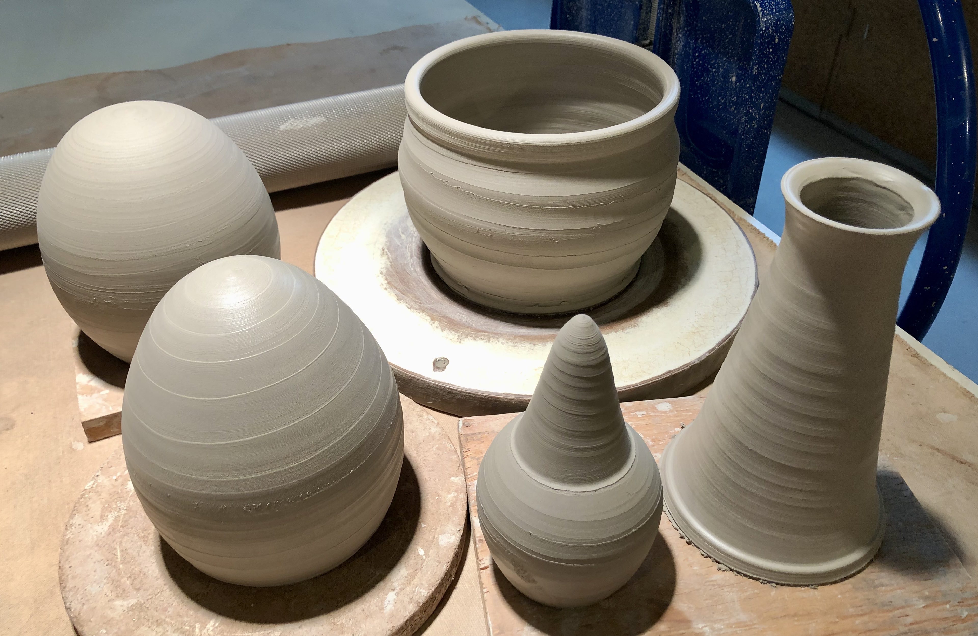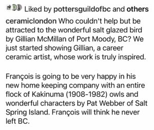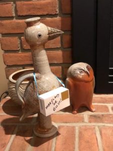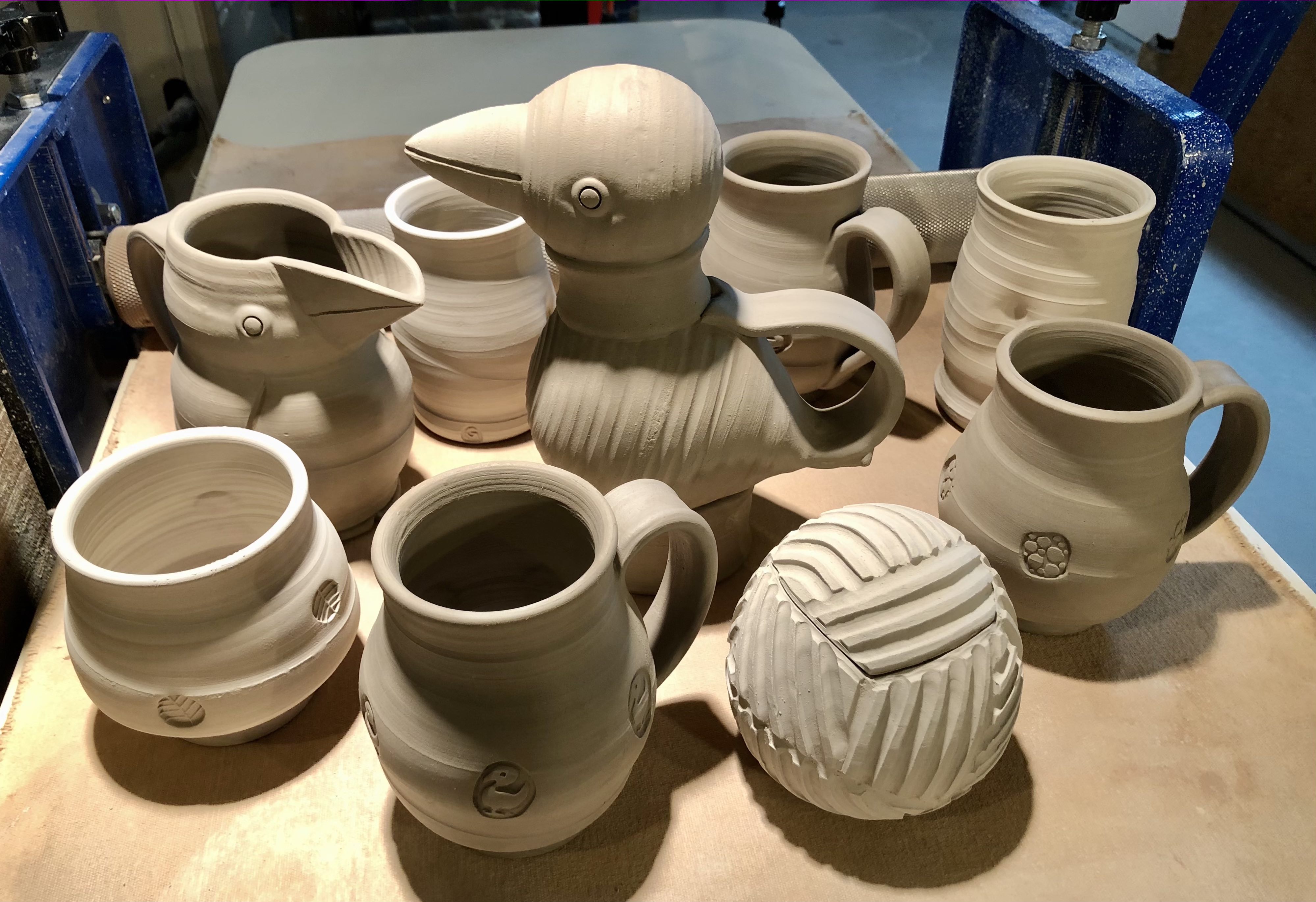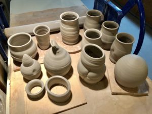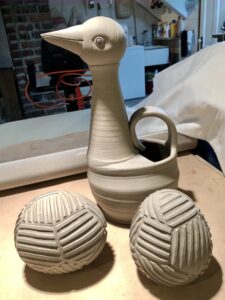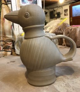 I registered to participate in a soda firing workshop in November, back in the beginning of September. So recently, after I’d finished filling my kiln with an assortment of plates and just a few jugbirds I switched over to using the grey Plainsman stoneware clay. Now I have enough ware to fill my allotted two square feet of space in the kiln for next week’s soda firing. The clay is quite different from the easy terra cotta earthenware and as I work I need to consider what I’ll choose for the surfaces. Again, hints from Jonathon have directed my work, so this batch includes some more silly bird vessels as well as eggs! I plan to spray them all with some flashing slips tomorrow and get them into a bisque firing on Saturday. There are two pieces that I shall hold back for a further firing in December with my old guild, Fraser Valley Potters. Although both firings will be conducted with strict Covid protocols I shall enjoy brief conversations with several clay friends from over the years.