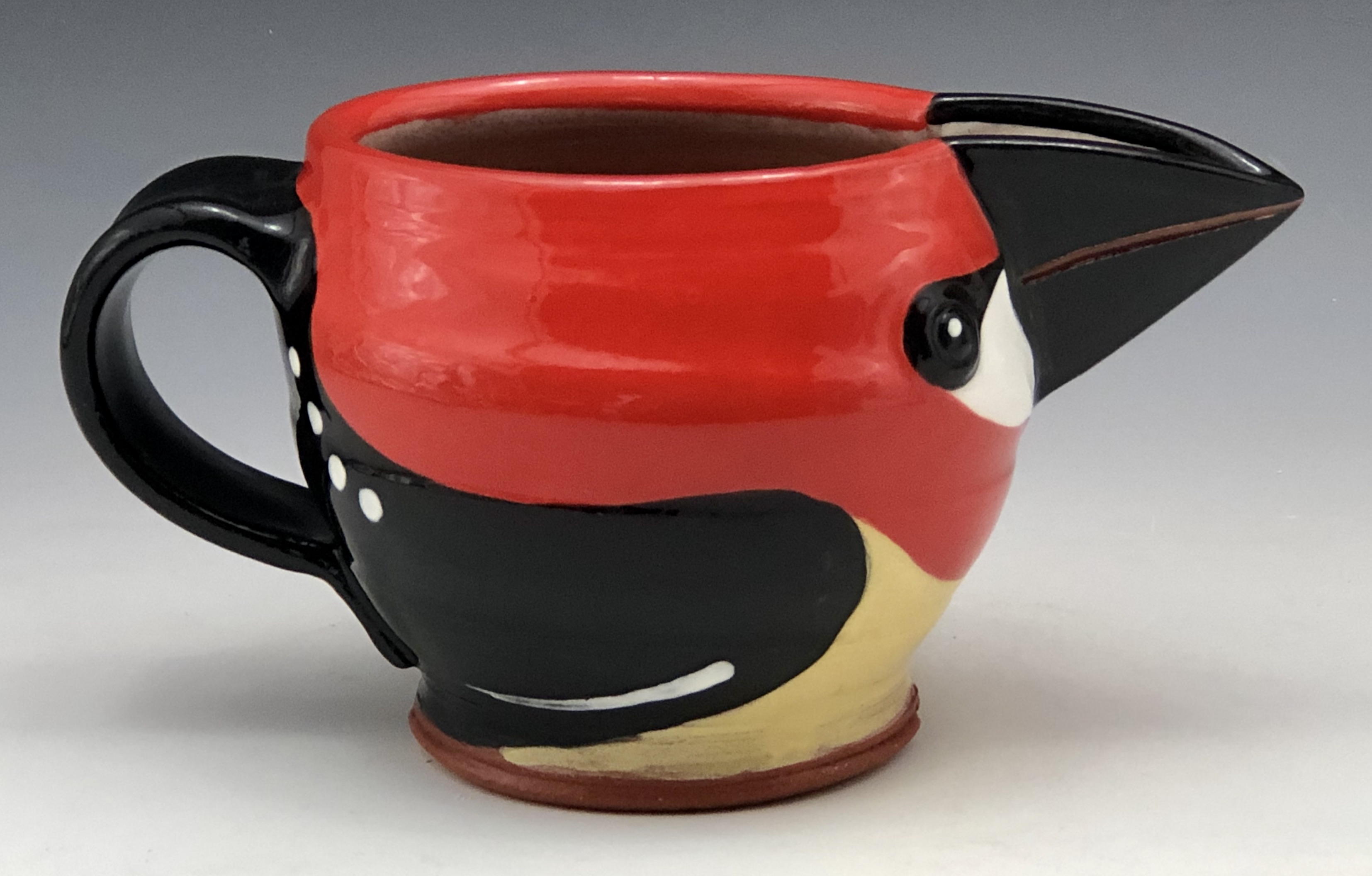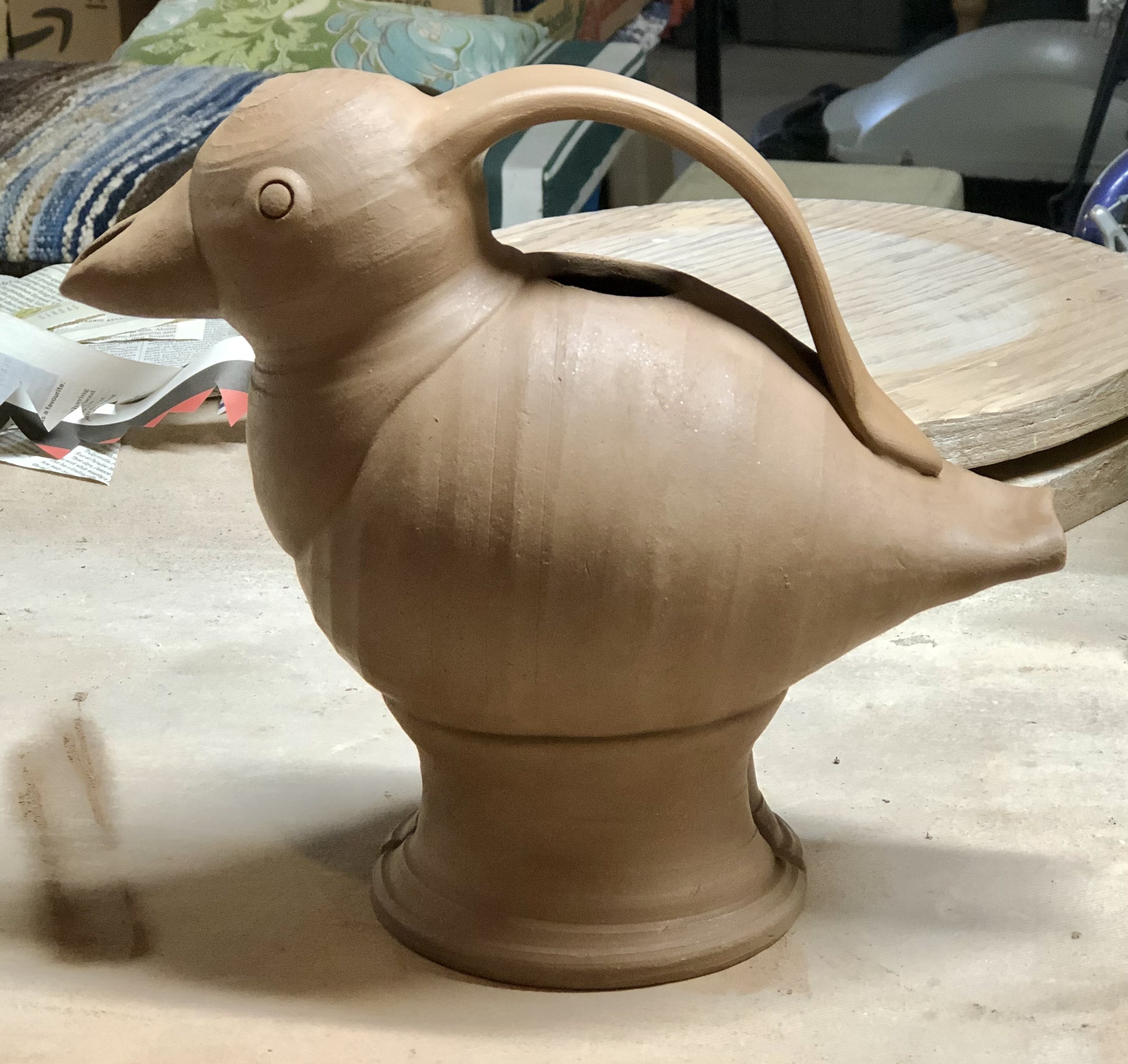 A special request had me researching duck shapes again. The Harlequin Duck doesn’t lend itself to being a tall jug so I opted to make him with three wheel-thrown parts, plus a teeny cone for his bill. These shapes wind up imitating the way a duck walks or swims. Then what is the best way to fill him? I decided to put a filling hole under the handle. It was a challenge to find the right slate-grey and russet patches for him.