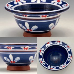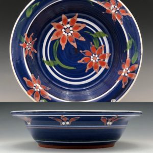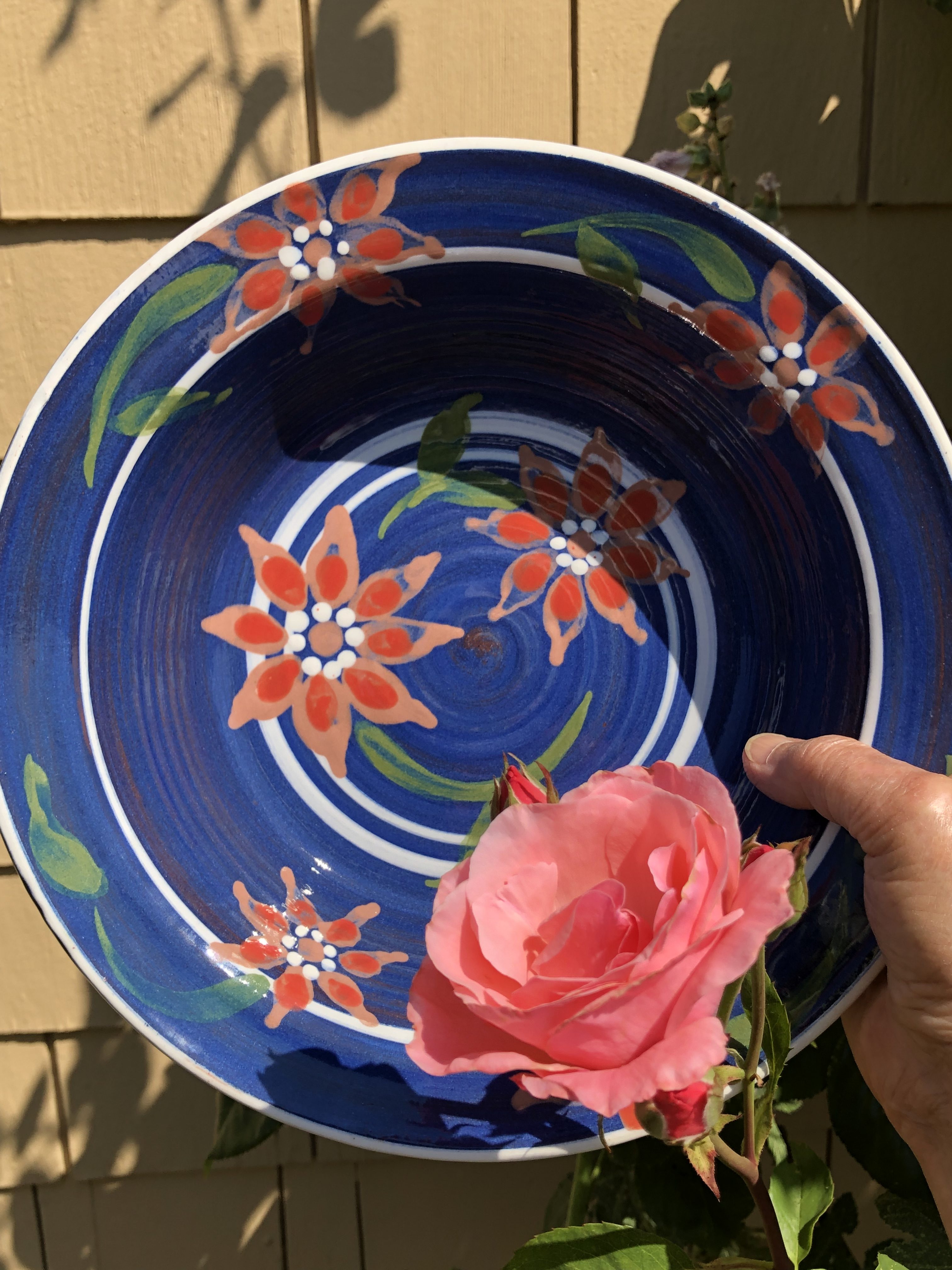 I keep trying to make larger pasta plates for a Calgary family. They ask for colourful and varied and large. These three might fit the bill and I am rather pleased with the blue one. I rarely use the Sienna pink slip but with a touch of red underglaze the flowers look good over the dark blue. It’s just lucky that this rose presented itself just as I was looking for a spot to photograph it.