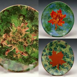 These are slab plates on which I used Port Moody artist Sara Graham’s Maple Leaf design as stencil and imprint.