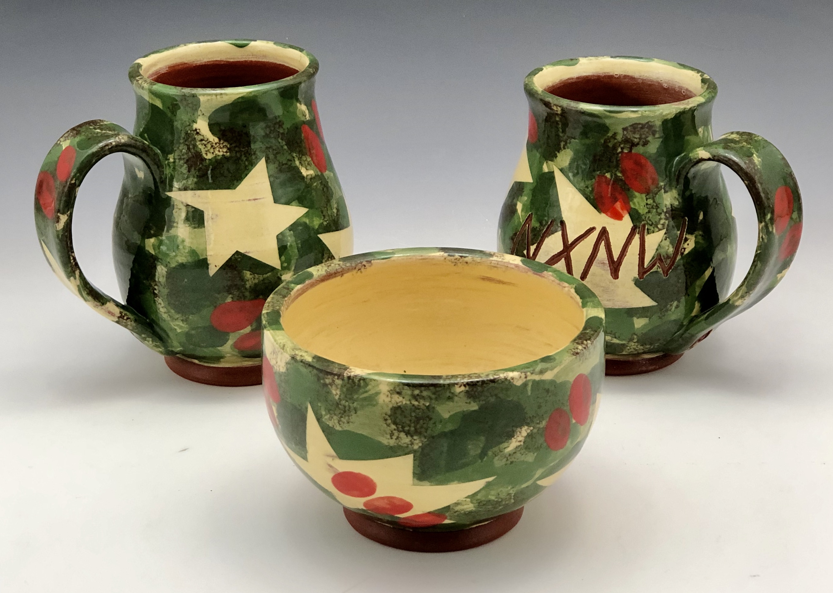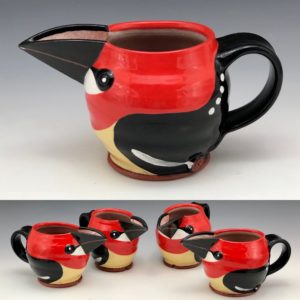 Every shelf in my latest bisque and glaze firings held plates, except for the top one. There I placed four requested Red-breasted Sapsucker Jugbirds, the ‘North by North-West (NXNW)’ mugs and two bowls for donation for the September NWCF fundraiser ‘That Pottery Thing’.