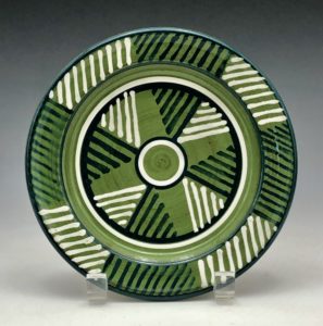 An idea I shall use again is this happy result of concentrated parallel line painting. The combination of lime green, peacock and porcelain white slips resulted in a pleasing design. It’s just a small 7″ plate.