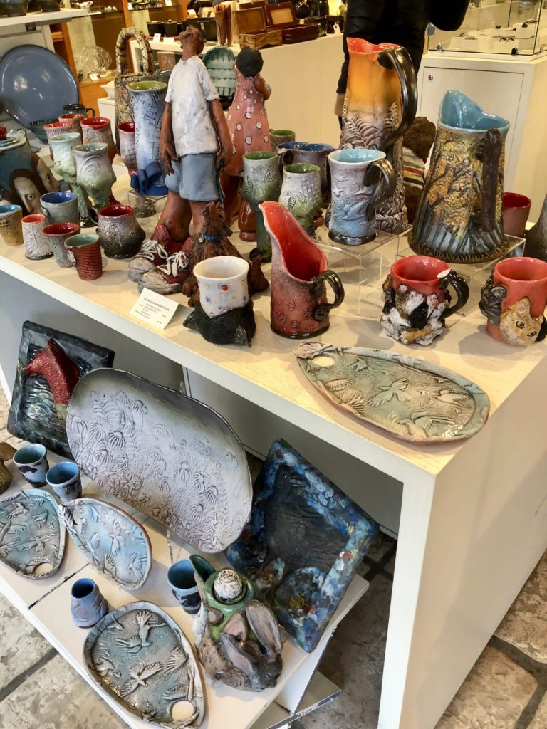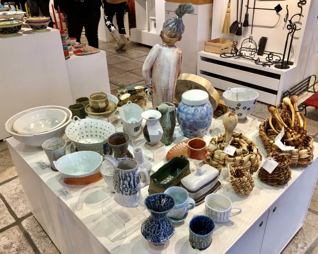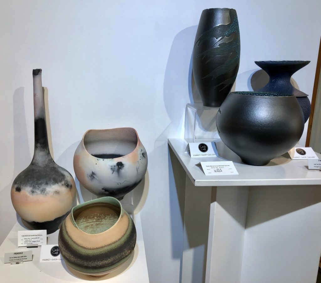 In the Circle Craft store I was greeted by John, who was enthusiastically discussing the pottery with visitors. Alexandra helped me to unwrap my Chicken pots and some soda pieces and then I had a chance to wander around to admire everybody else’s work.