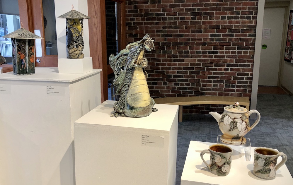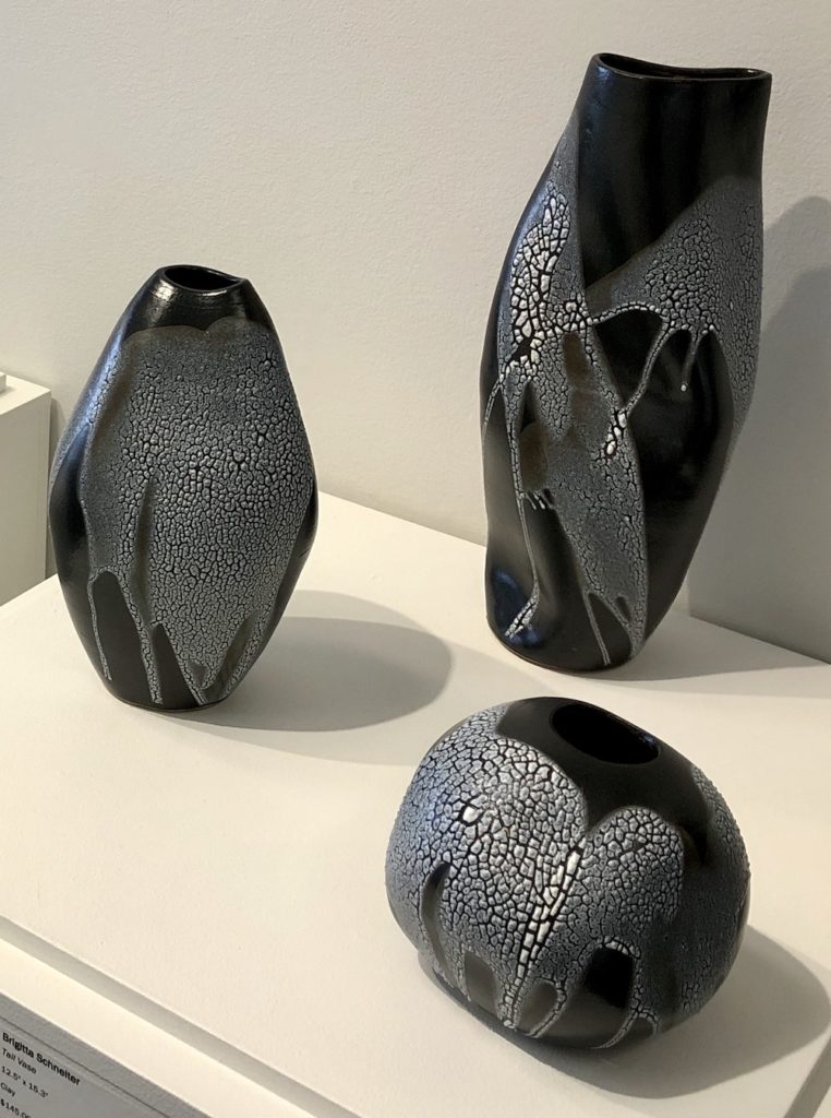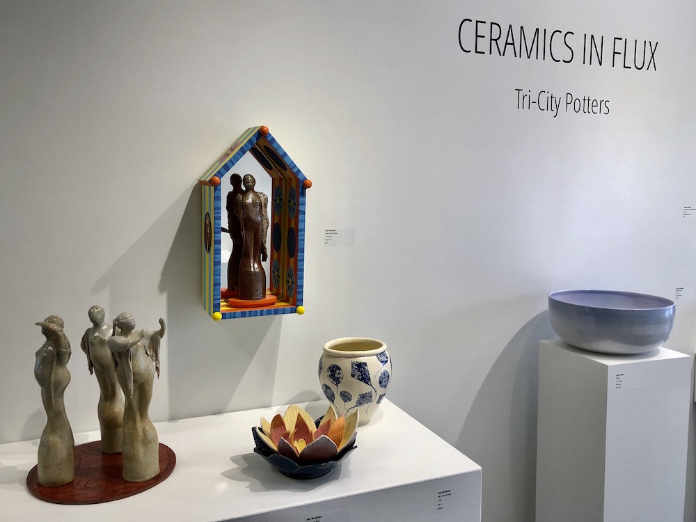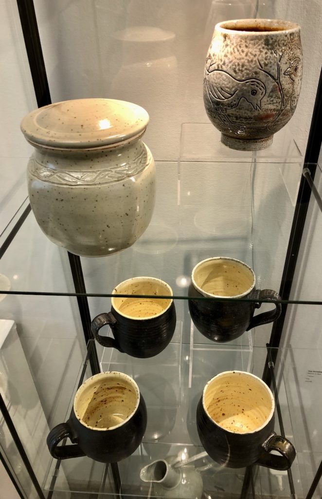 On Friday afternoon I had a chance to wander through the three galleries at PoMoArts and to take a better look at the shows. Several others were looking too, including a man who is taking classes at the Clay Warehouse in Port Coquitlam, had attended the opening the night before and was enthusiastically showing all the work to a friend. I encouraged them to join TCP at our monthly meetings in the Arts Centre, on the third Wednesday of each month.