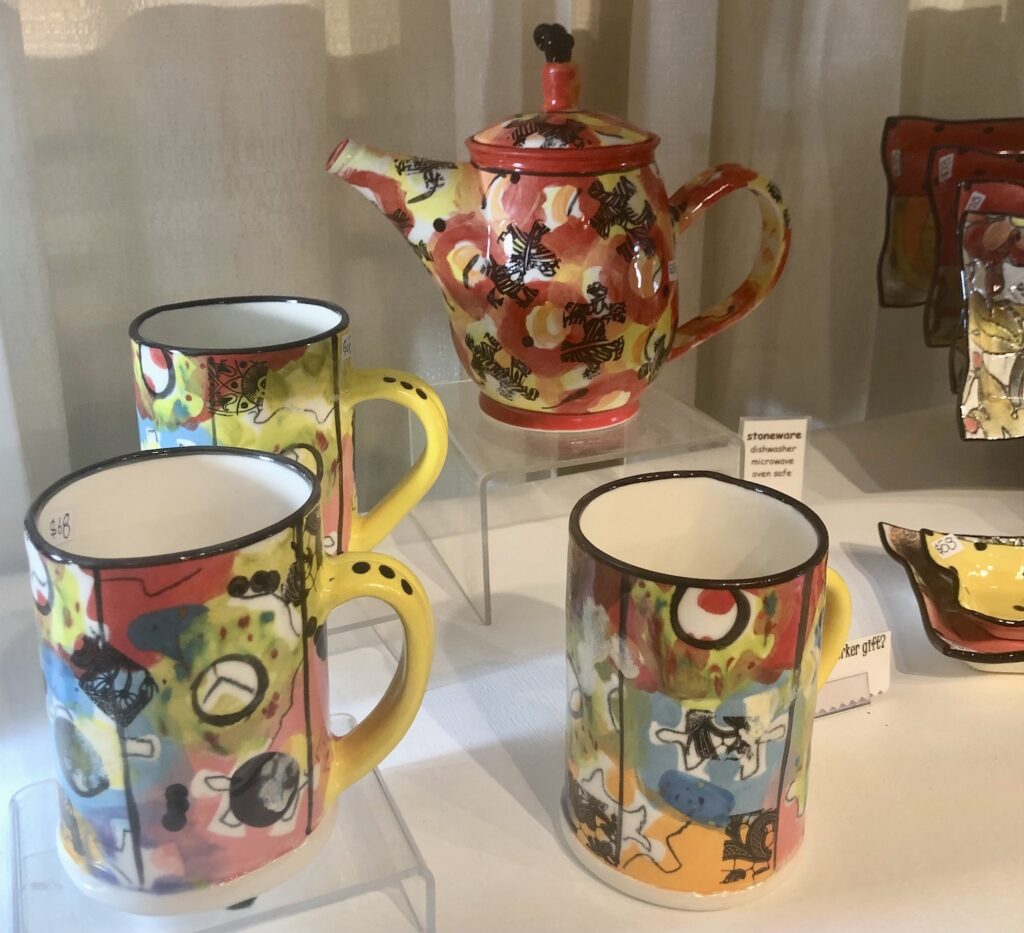 Laura Van der Linde’s wonderfully colourful ware had me stop for a while. No, I mustn’t buy any more but I hope many others did. Take a look.